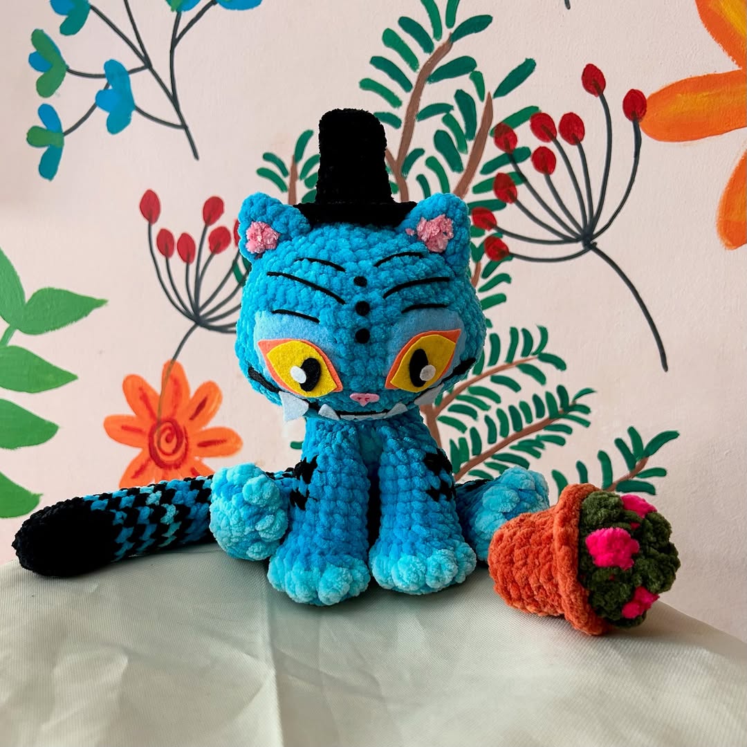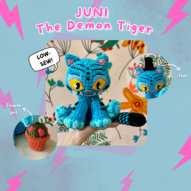 3in1 Juni The Demon Tiger + hat + flowerpot inspired by Kpop Demon Hunters. This pattern is Intermediate level.